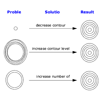 If no peaks are visible, try decreasing the contour level to cut lower into the spectrum. If the peaks are outlined but you do not see the circles shrinking to define the tops of the resonances, try increasing the level multiplier to increase the space between levels: